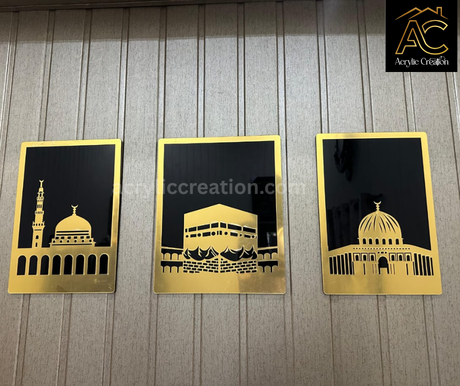 Premium Acrylic Set of Three Islamic Wall Frame | Khaana Kaaba , Masjid Al Nabwi and Masjid Al Aqsa | Islamic Home Decor